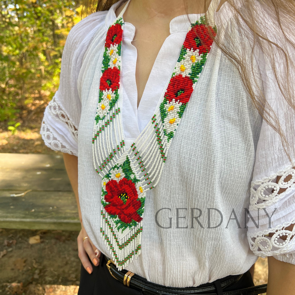 Цей гердан належить до преміум колекції: він ширший, має складний багаторівневий візерунок та вимагає 8–10 годин ручної праці досвідченого майстра. Кожна бісеринка вплетена з любов’ю, щоб створити справжній витвір мистецтва.