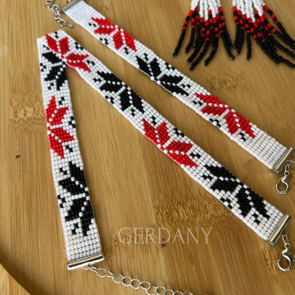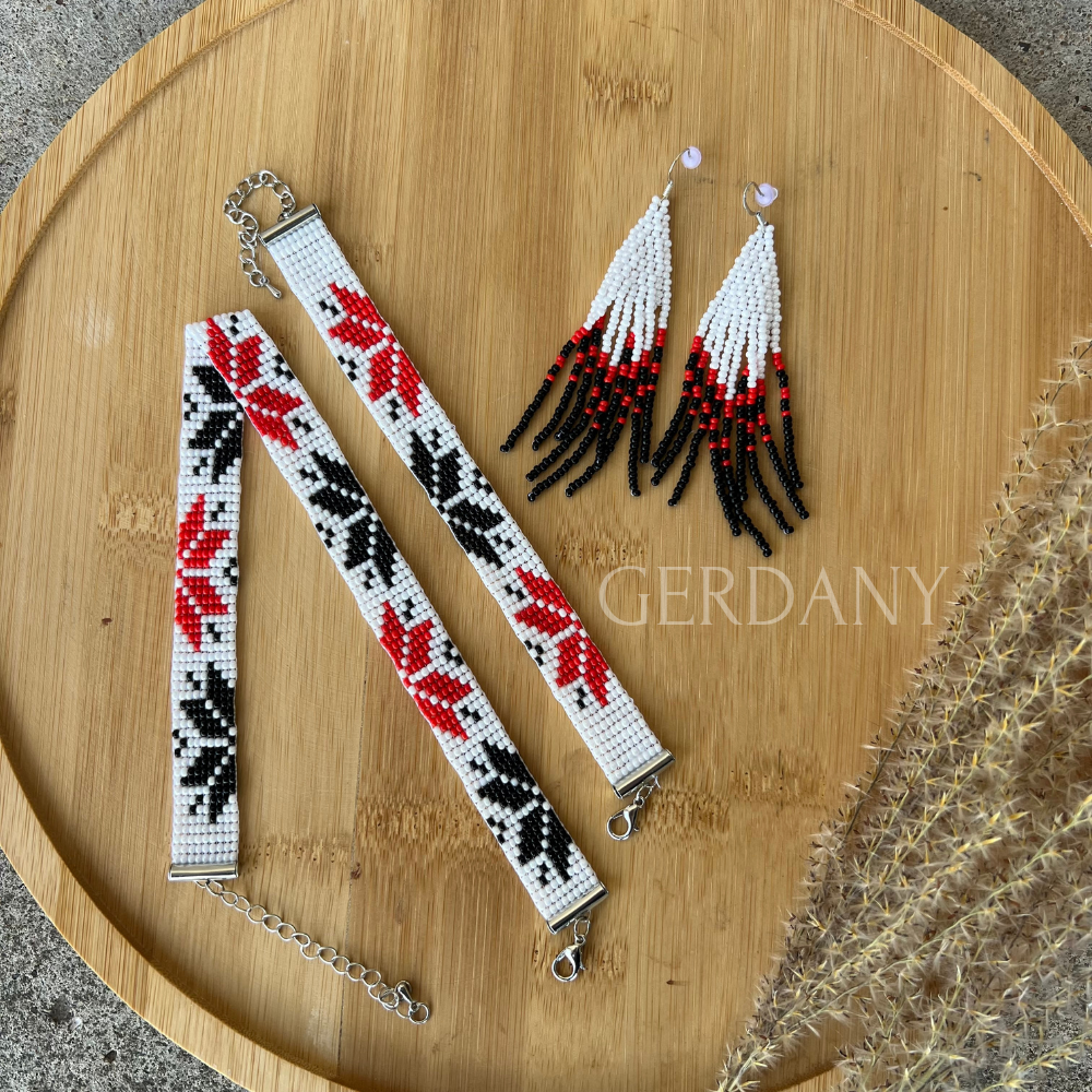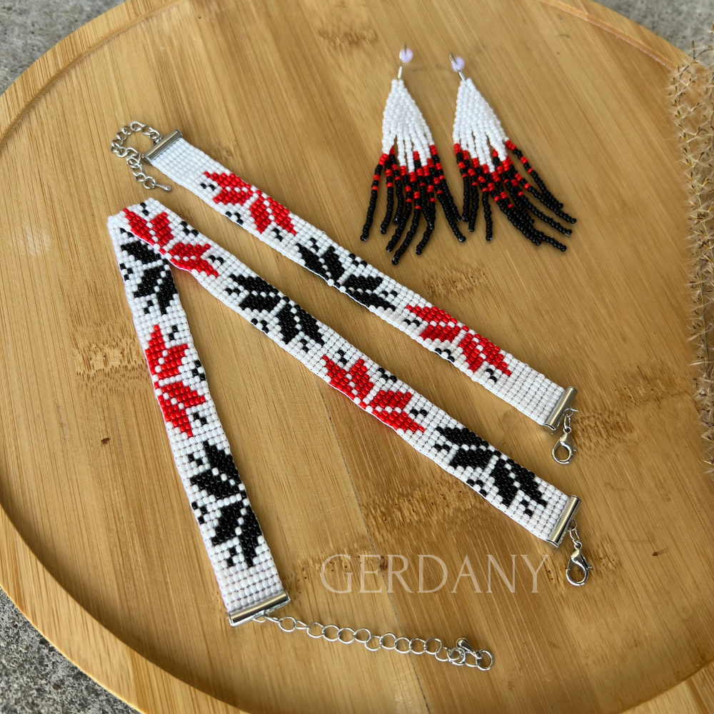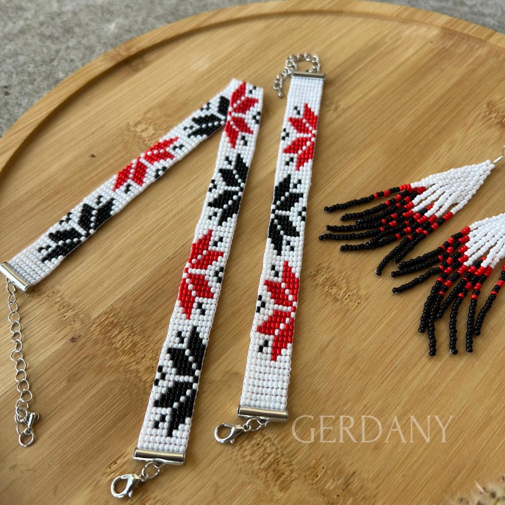 Усі елементи виготовлені вручну з високоякісного чеського бісеру у класичних кольорах — чорному, червоному та білому.