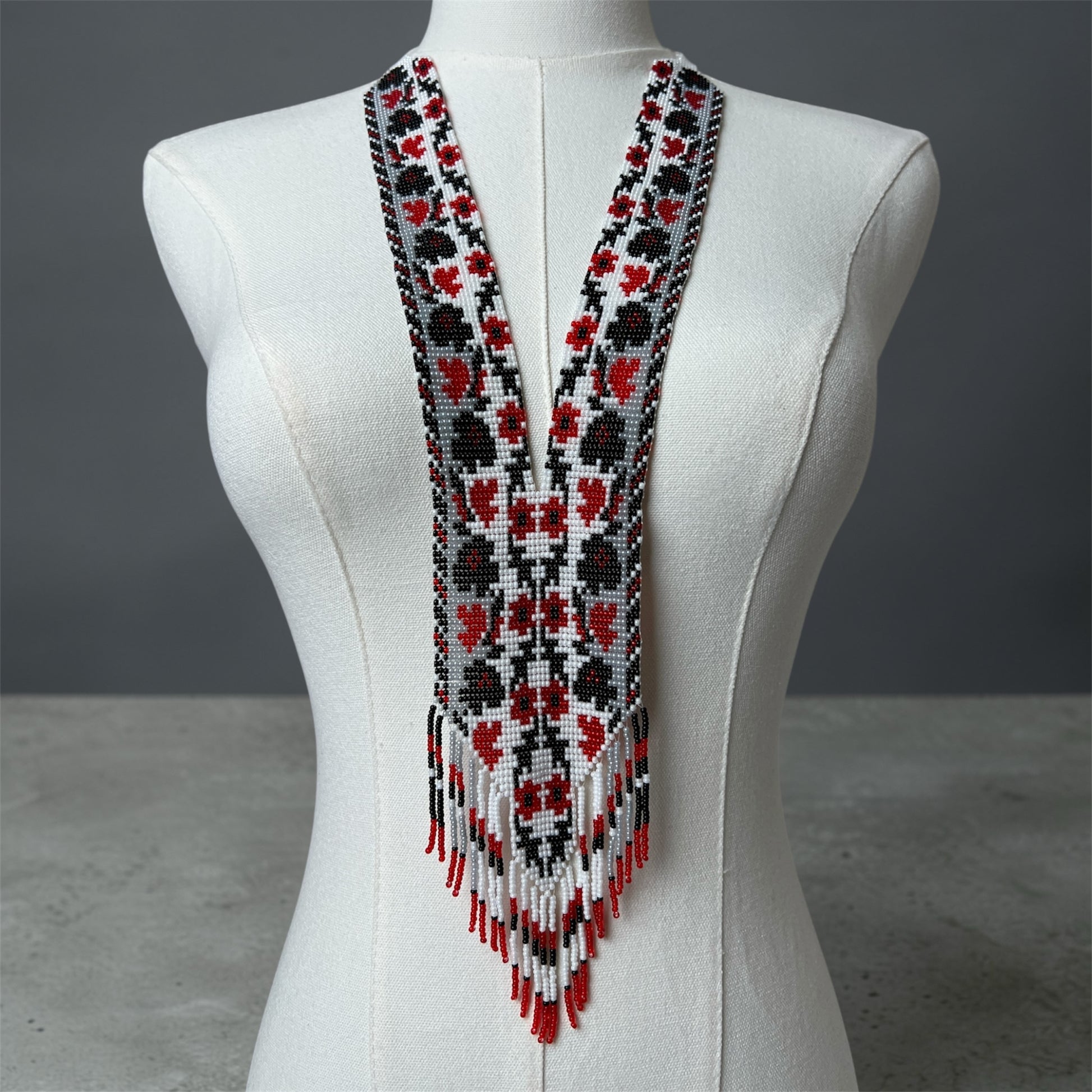 Гердан з широким орнаментом, виготовлений з чеського бісеру. Продумане поєднання кольорів, форм і ритму орнаменту робить його виразною прикрасою преміум-рівня для особливих подій і акцентних образів. На виконання такого виробу йде біля 10 годин роботи майстра